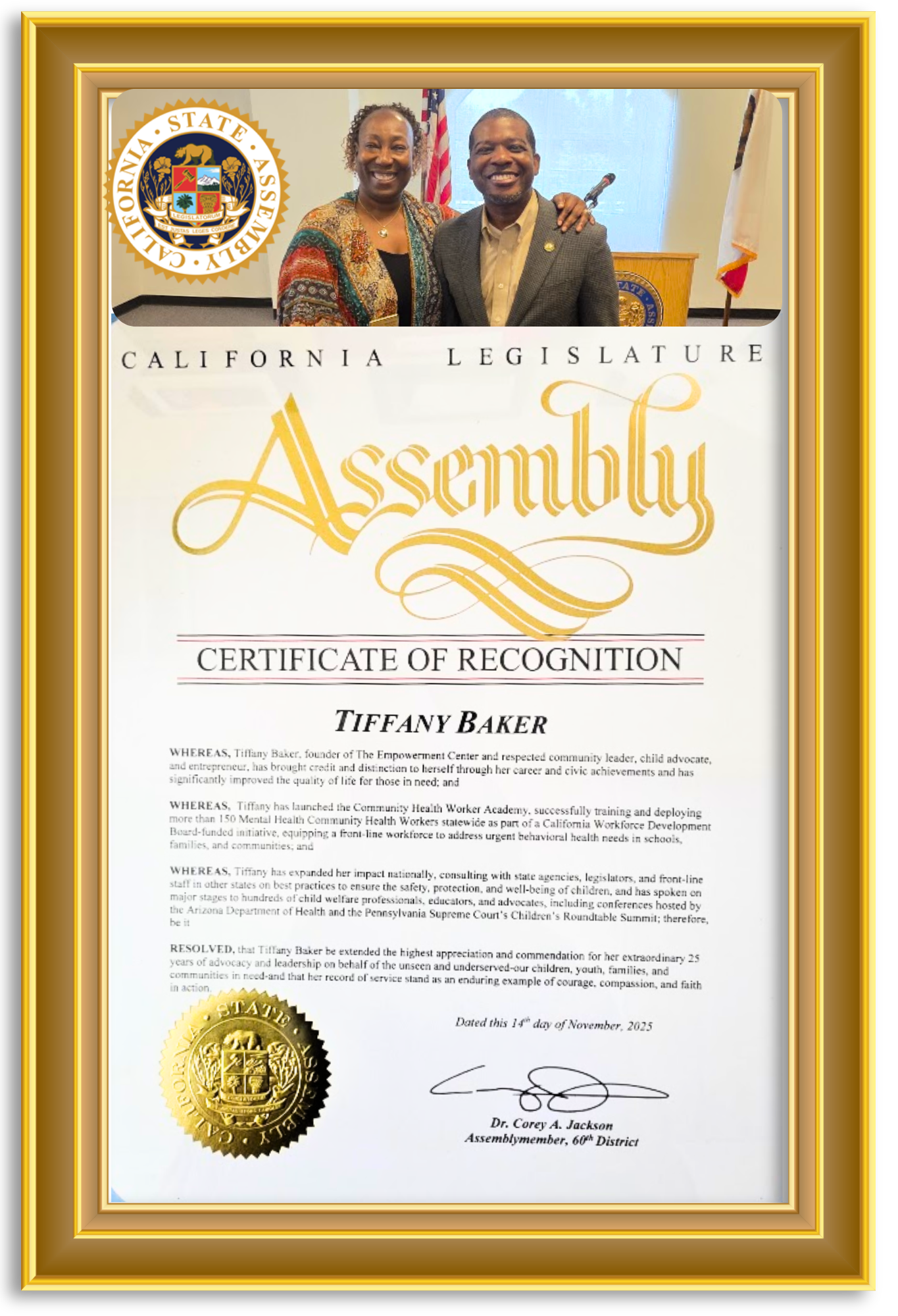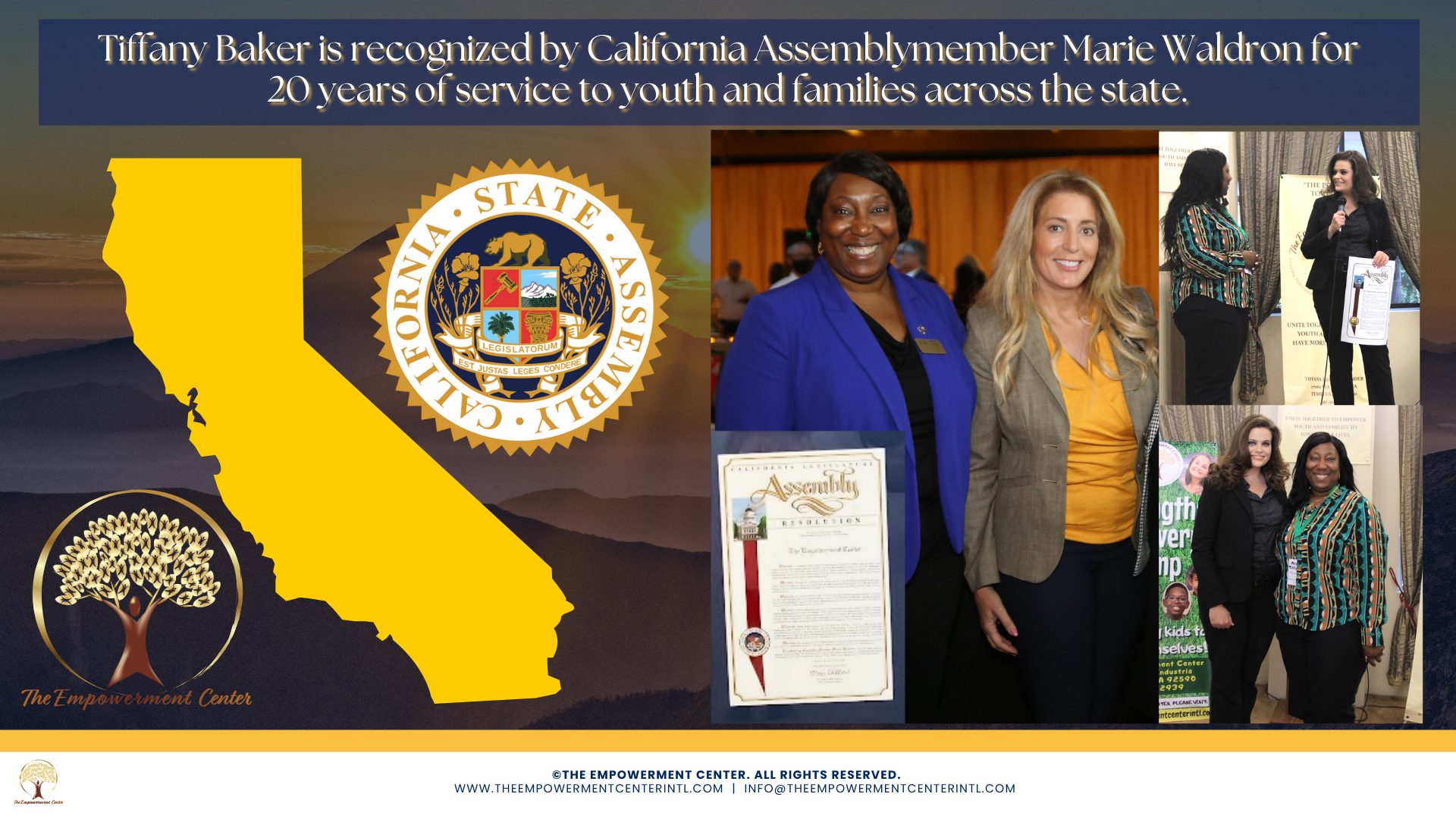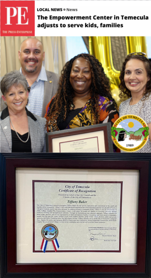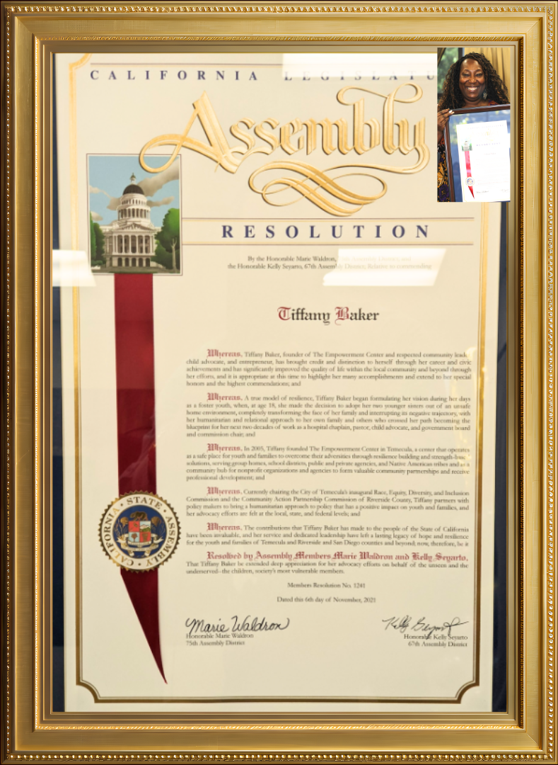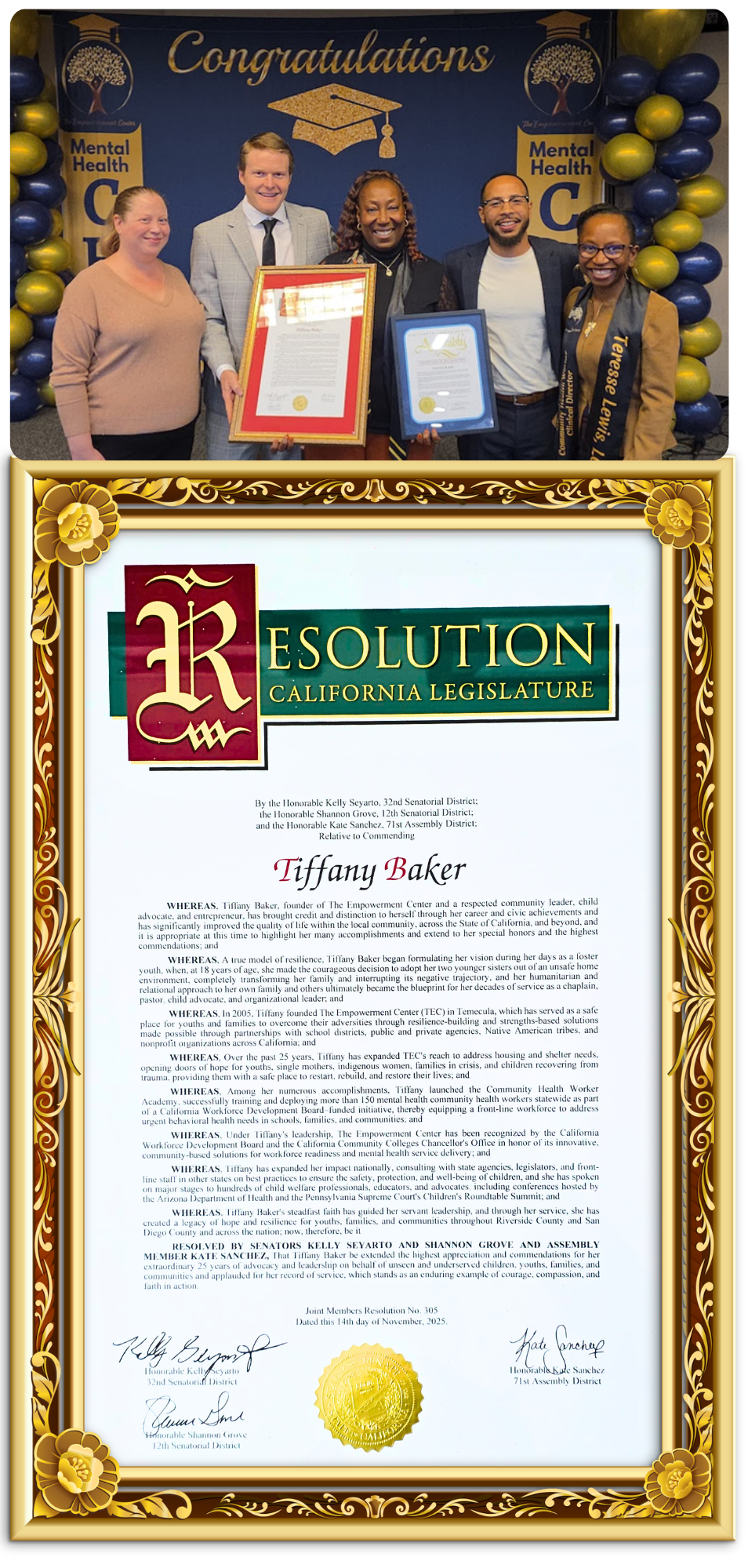 Whereas, in 2005, Tiffany founded The Empowerment Center (TEC) in Temecula, which has served as a safe place for youth and families to overcome their adversities through resilience-building and strengths-based solutions, made possible through partnerships with school districts, public and private agencies, Native American tribes, and nonprofit organizations across California; and
